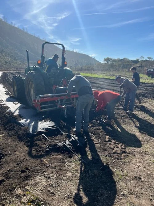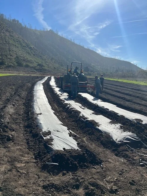 Drip tape is laid down the center of each bed, followed by plastic mulch. The plastic helps conserve moisture, warm the soil, and reduce early weed pressure. We adjust the plastic by hand to keep it tight and secure.