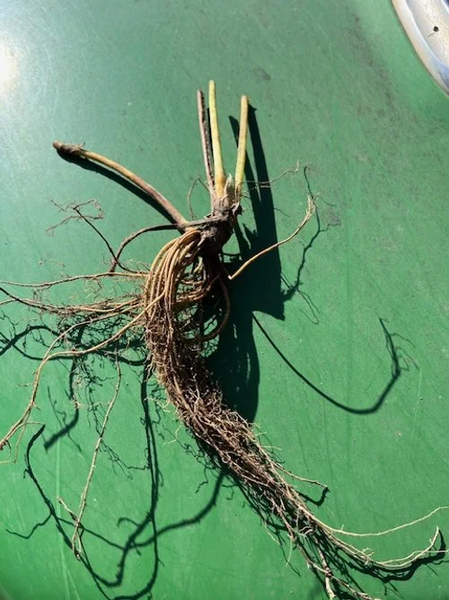 Bare-root strawberry plants with long, healthy roots ready for planting.